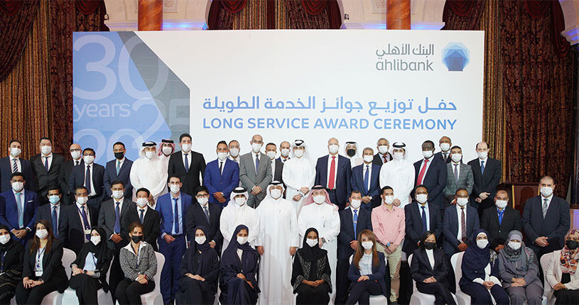 :"أتقدم بالتهنئة لموظفي الخدمة الطويلة وأشكرهم على عملهم وولائهم للبنك خلال السنوات العديدة. إن البنك يمر في مرحلة تطوير، ويستمر بتنفيذ استراتيجياته التي تهدف إلى تحسين صورة البنك ووضعه في السوق المحلي، وتقديم أفضل الخدمات المصرفية على الإطلاق. إن النجاح لن ولم يتحقق إلا بجهودكم وبنجاحكم. شكراً مرة أخرى لعملكم الجاد وشكراً لأنكم من شركاء النجاح، ونأمل أن تستمر مسيرة النجاح والتقدم للبنك الأهلي."