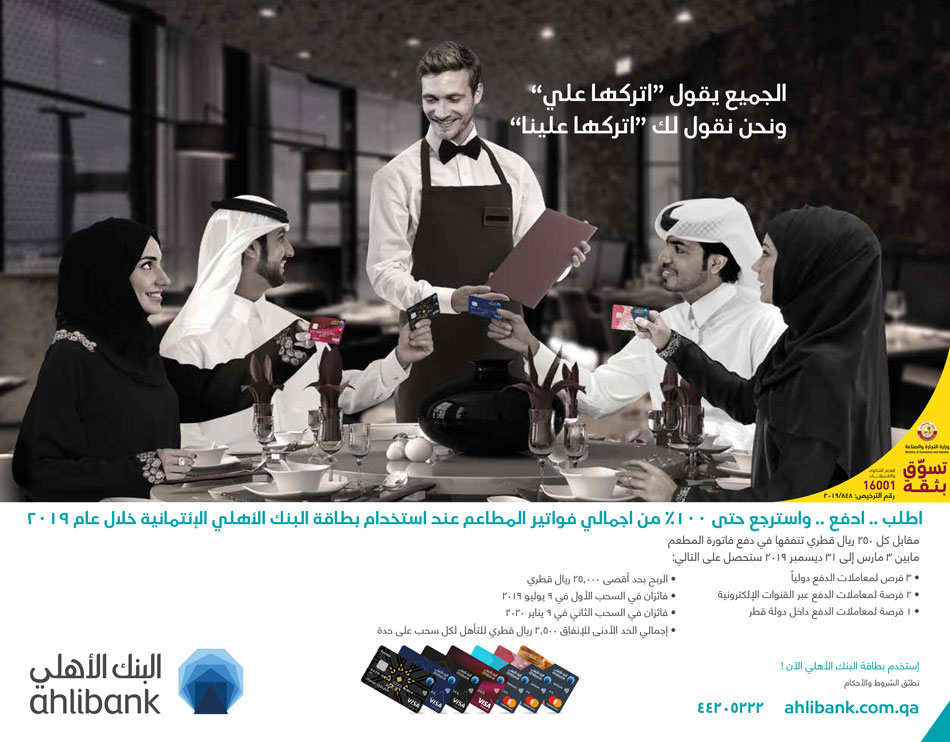 اطلب .. ادفع .. واسترجع حتى100 ٪ من اجمالي فواتير المطاعم عند استخدام بطاقة البنك الأهلي الإئتمانية خلال عام 2019