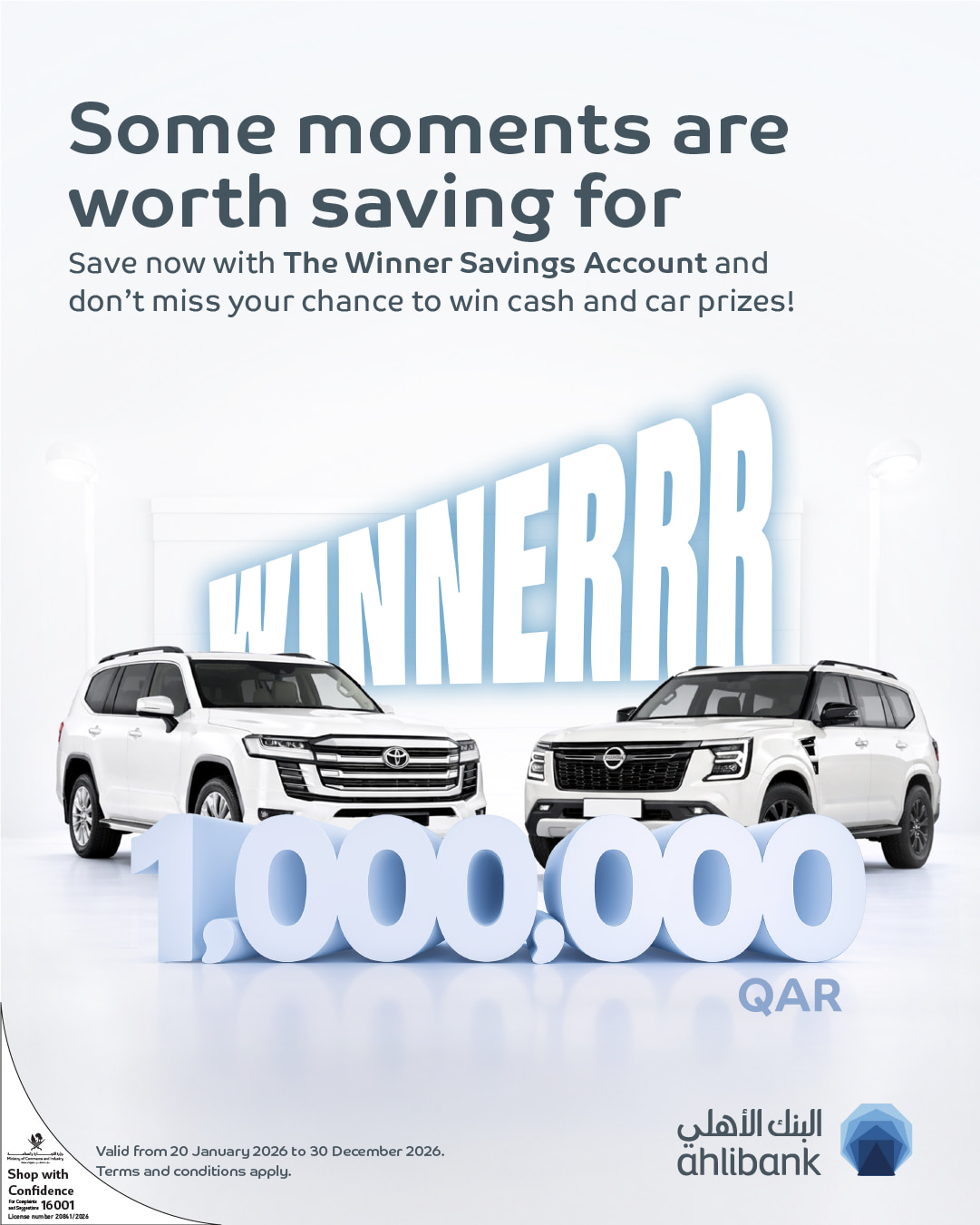 The Winner Savings Account is open to all customers who wish to save while enjoying the added benefit of potential rewards. Participation is simple, customers need to open The Winner Savings account and maintain a minimum amount of 5,000 QAR to be eligible to enter the draws. Each QAR 1,000 gives customers one chance to enter the various draws. The Winner Savings Account invites everyone to start their savings journey, combining financial peace of mind with the possibility of life-changing rewards, campaign is valid until 30 December 2026.