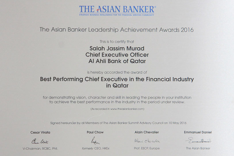 Asian Banker honours Ahli Bank (QPSC) with Best Managed Bank in Qatar and Best CEO in 2016