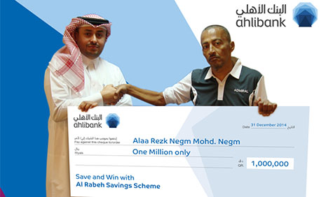 Mr. Hassan Al-Frangi, Head of Retail Banking Services, presented the cheque to Mr Alaa and said “I am delighted to be presenting this cheque for QAR 1 Million to Mr Alaa who has been a customer since 2007 and look forward to further enhancing his long standing relationship with Ahlibank”.