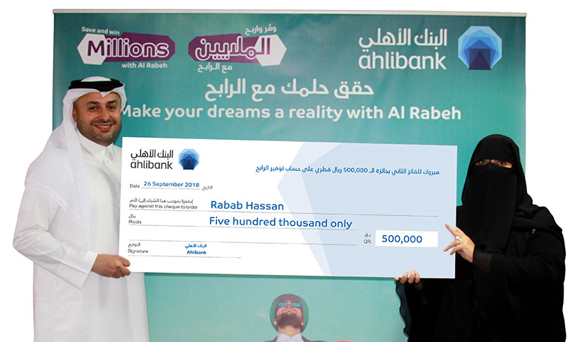 Ahlibank’s Al Rabeh Savings Scheme customer Mrs. Rabab Hussain wins QAR 500,000 prize for September 2018. Mrs. Rabab Hassan, an Abu Hamour Branch customer, was delighted to know that she has been rewarded for being a loyal Al Rabeh Savings Scheme customer.